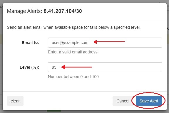 Enable or clear alert emails for an IP block by setting an email address and utilization percentage level. When the block is utilized to the set percent, an email alert will be sent to the provided address.