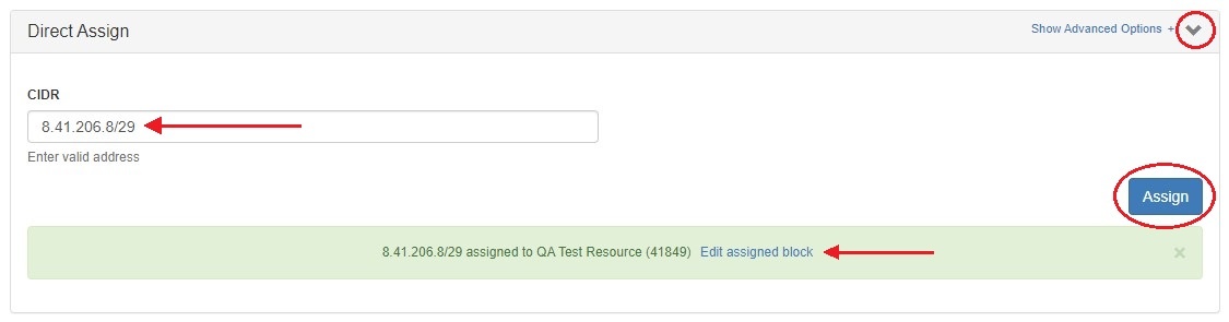 Direct Assign is used when you know the exact CIDR that you wish to assign to the Resource. You can use "Simple" direct assign, for straightforward assignments of a CIDR to the Resource, or "Advanced", used in cases where duplicate blocks may exist and you need additional criteria to differentiate between them.