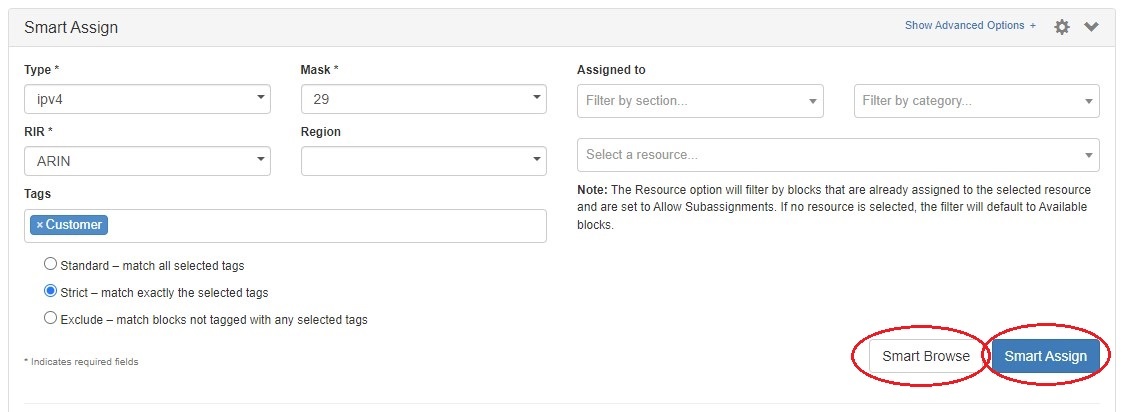 With Smart Assign, you enter criteria such as IP Type, Size, RIR, Region, and Tag information, then ProVision's automation will automatically assign a block meeting that criteria, if any exist. Smart Browse uses the same criteria, but provides a browsable list of blocks meeting that criteria for you to select from. Users can also save commonly applied Smart Assign / Smart Browse filter criteria for repeat use as Predefined Filters.