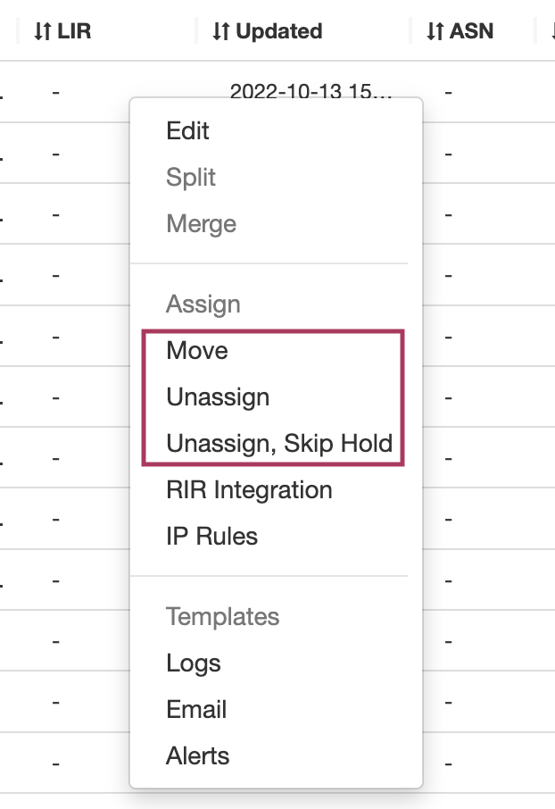 - Move: Moves IP Blocks from one resource to another without the need to pass through either the Holding or Available status.