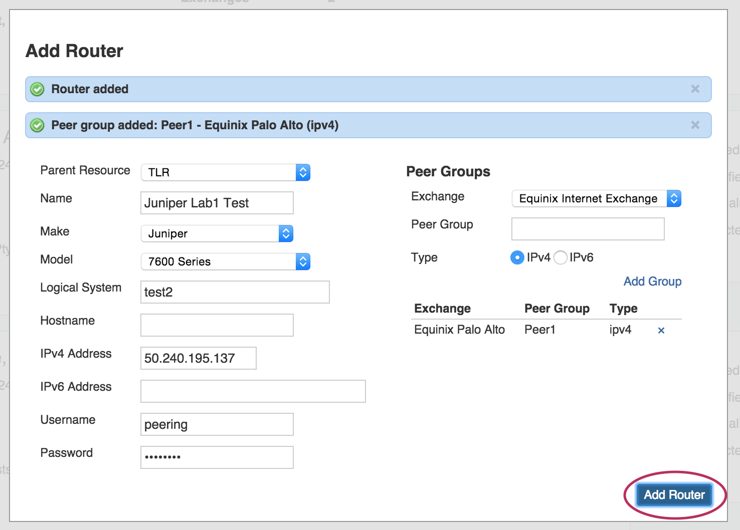 Type the Logical Systems information for the router, then resume entering the rest of the router information and peer groups. Hit "Add Router" when complete.