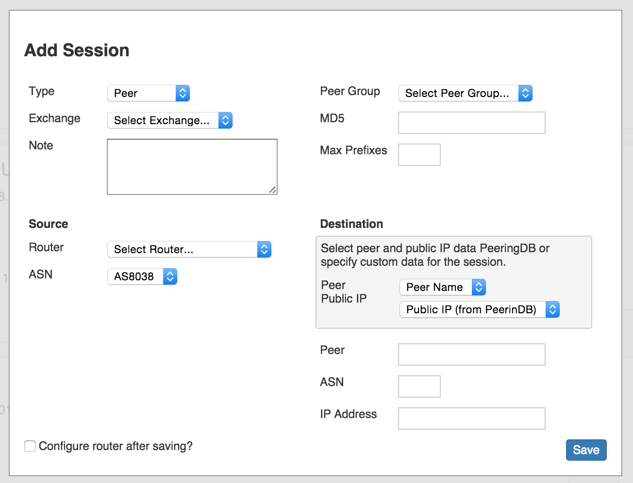The Peer Group associated with that router / Logical System will automatically be selected. Continue to fill in your session information, then hit "Save".