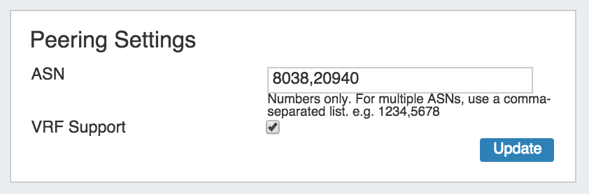 ASN : Enter the ASN(s) that will be used for Peering, or may leave blank. Separate multiple ASNs with a comma.