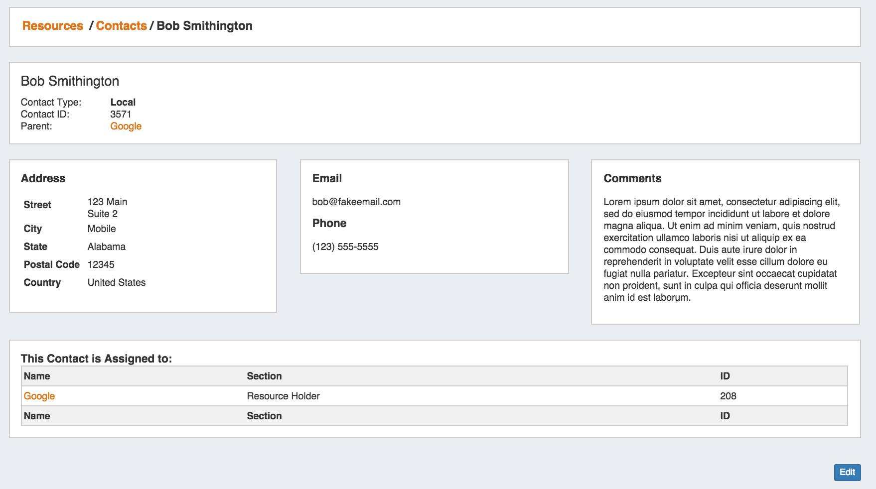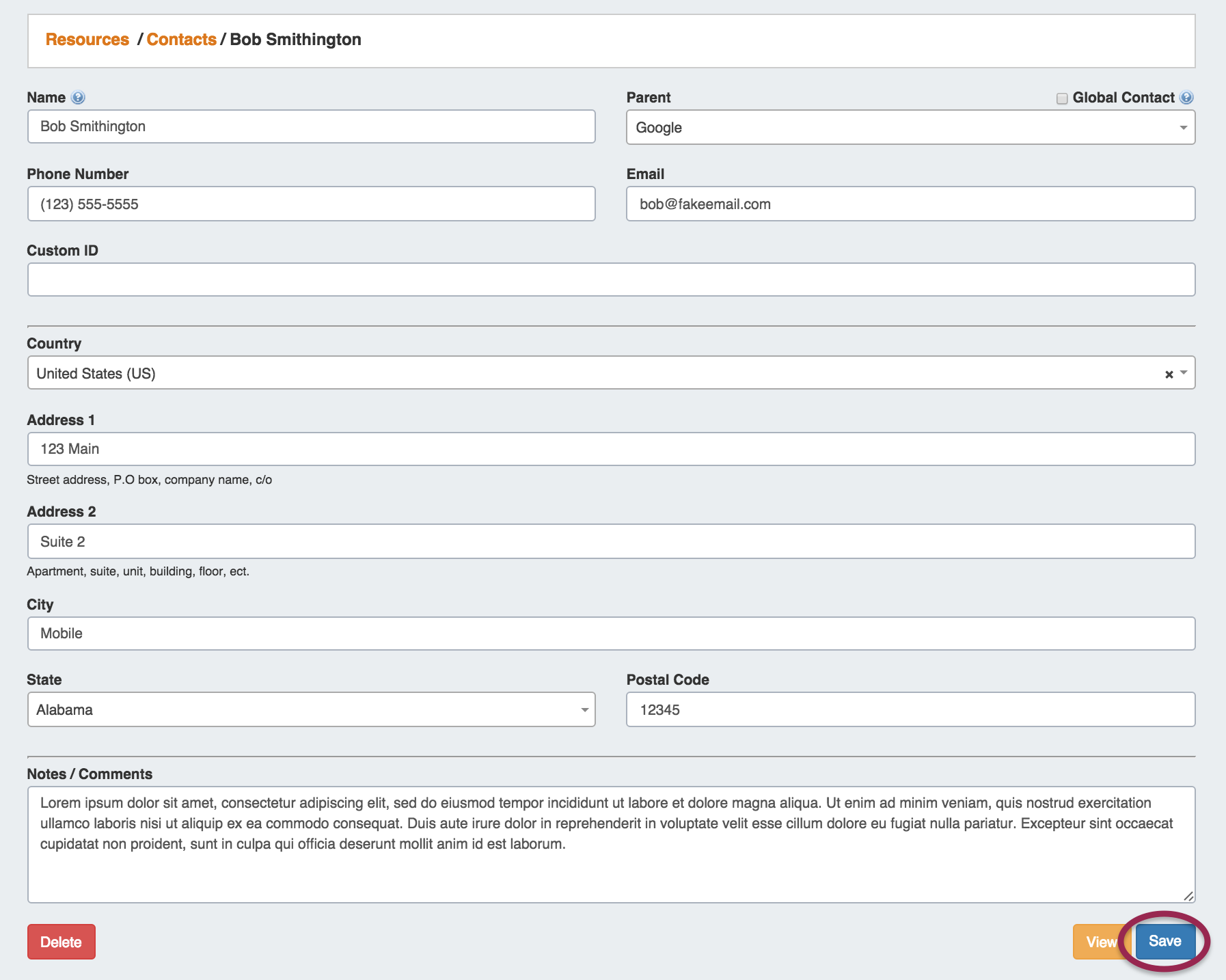 Fill in the contact's information for Name, Parent Resource (if desired), Phone, Custom ID, Email, Address, and Comments if desired.