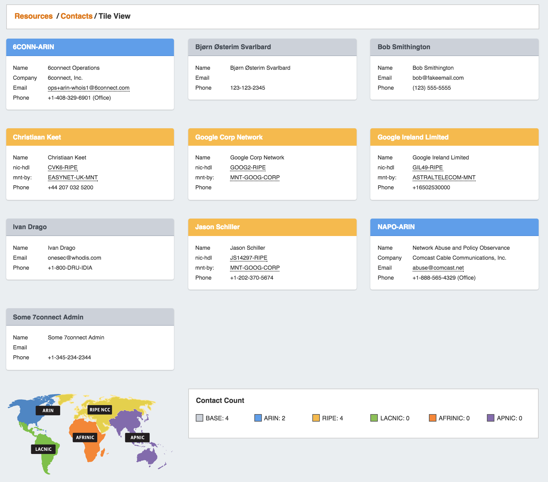 At the bottom of the Tile View page, counts of current contacts by RIR as well as an image map are provided. At this time, only Base (Local), ARIN, and RIPE contacts are supported.