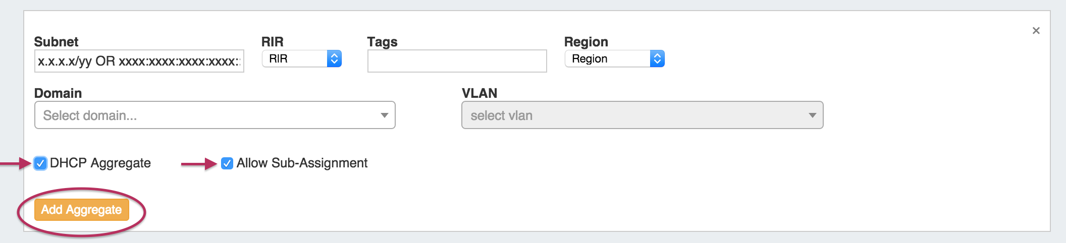 Fill in the aggregate information, and select the  "DHCP Aggregate" checkbox option as outlined below. "Allow Sub-Assignment" will be selected automatically,so that smaller blocks may be assigned to DHCP pools.