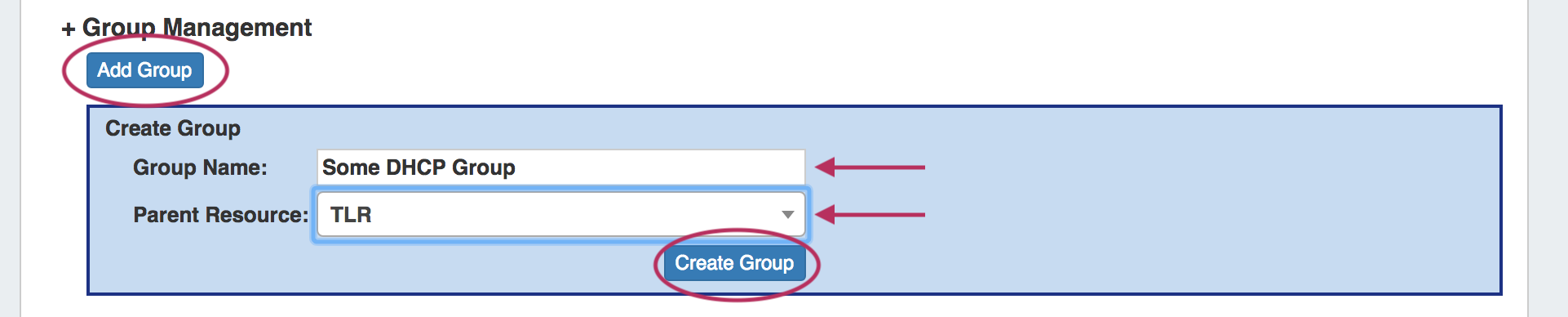 A "Default Group" should be available immediately, or you can click the "Add Group" button to create a new DHCP Group. Type in the desired Group Name and select a Parent Resource for the Group, then click "Create Group".