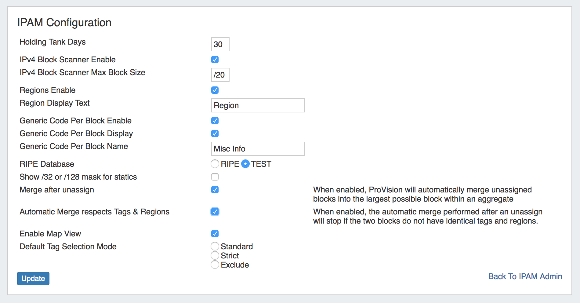 Regions Enable: Check the box to enable "Region" tags for IP blocks. This will add a "Region" column to the IPAM Manage screen. Values may be set from "Edit IPAM Regions" under IPAM Admin - IPAM Lists Management.