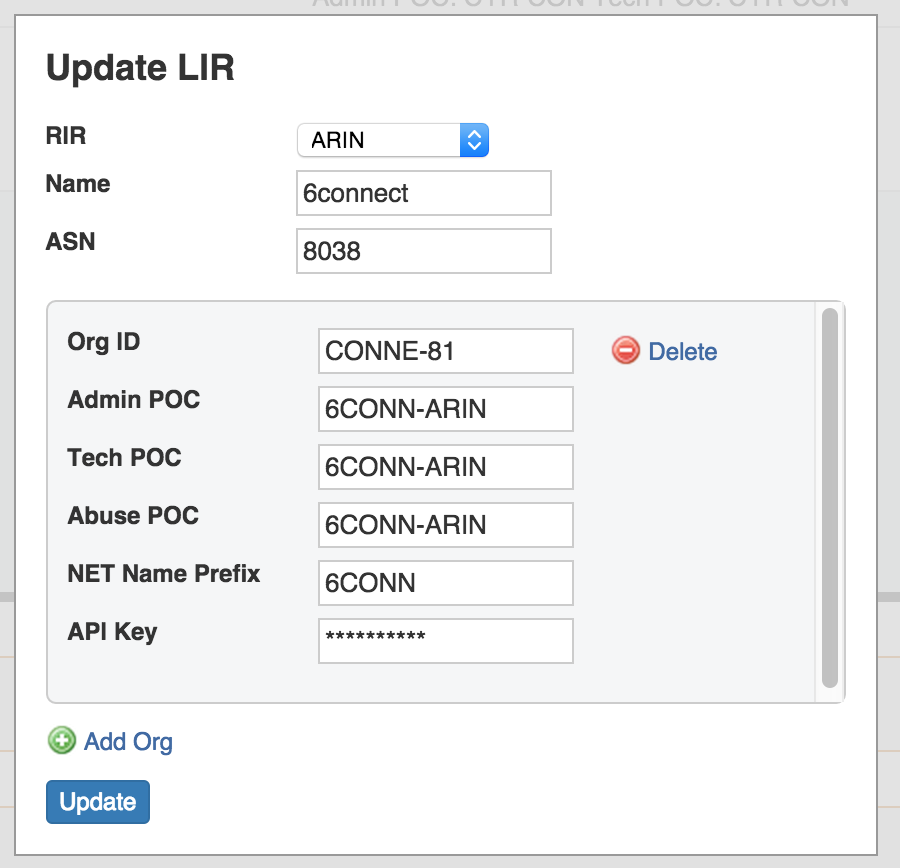 Edit a LIR by clicking on the Action Menu (wrench icon) next to the entry in the LIR Manager. The Update LIR dialog will open. From here, you can edit RIR, Name, ASN, and Org information, as well as add / delete Orgs.