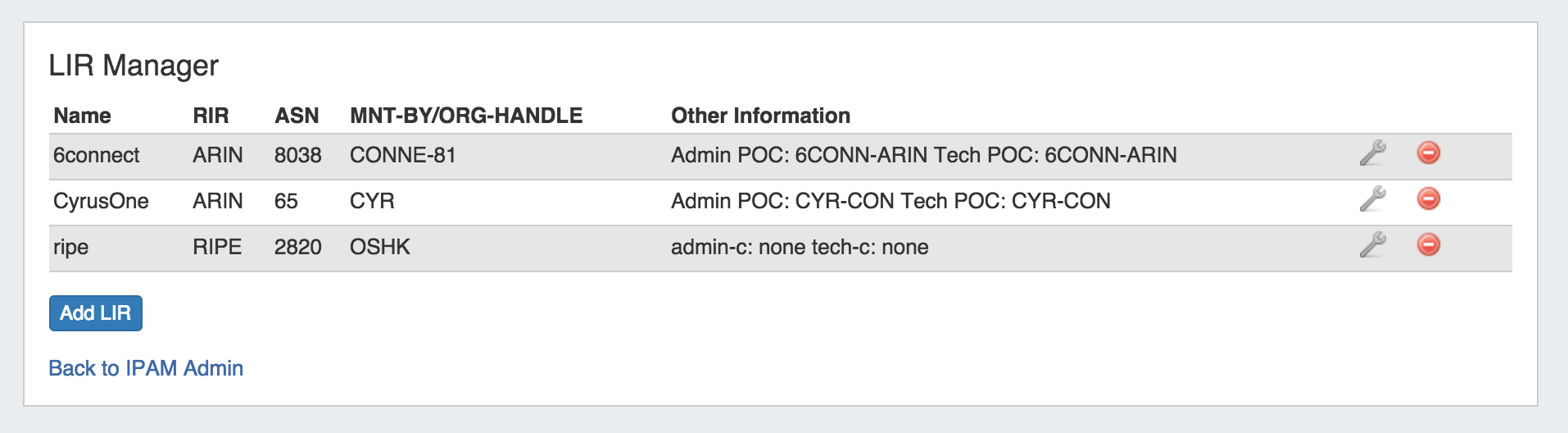 You will be taken to the LIR Manager page, showing your current LIRs. You may Add LIRs, edit the existing LIRS by hitting the Action Menu (wrench icon), or delete LIRs through the red delete icon.