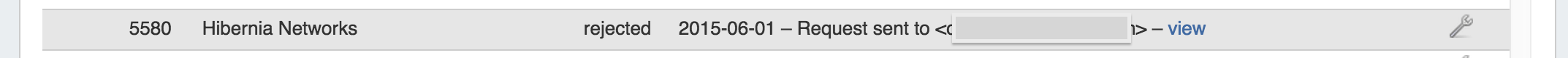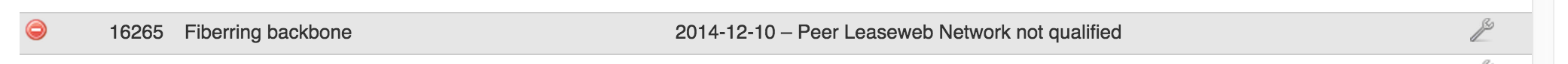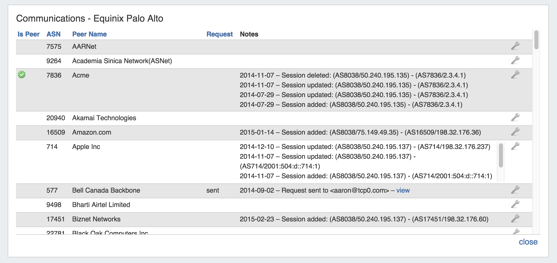You will see the list of Peers, their ASNs, Name, Request Status, Notes (log), and the Action Menu (wrench icon).