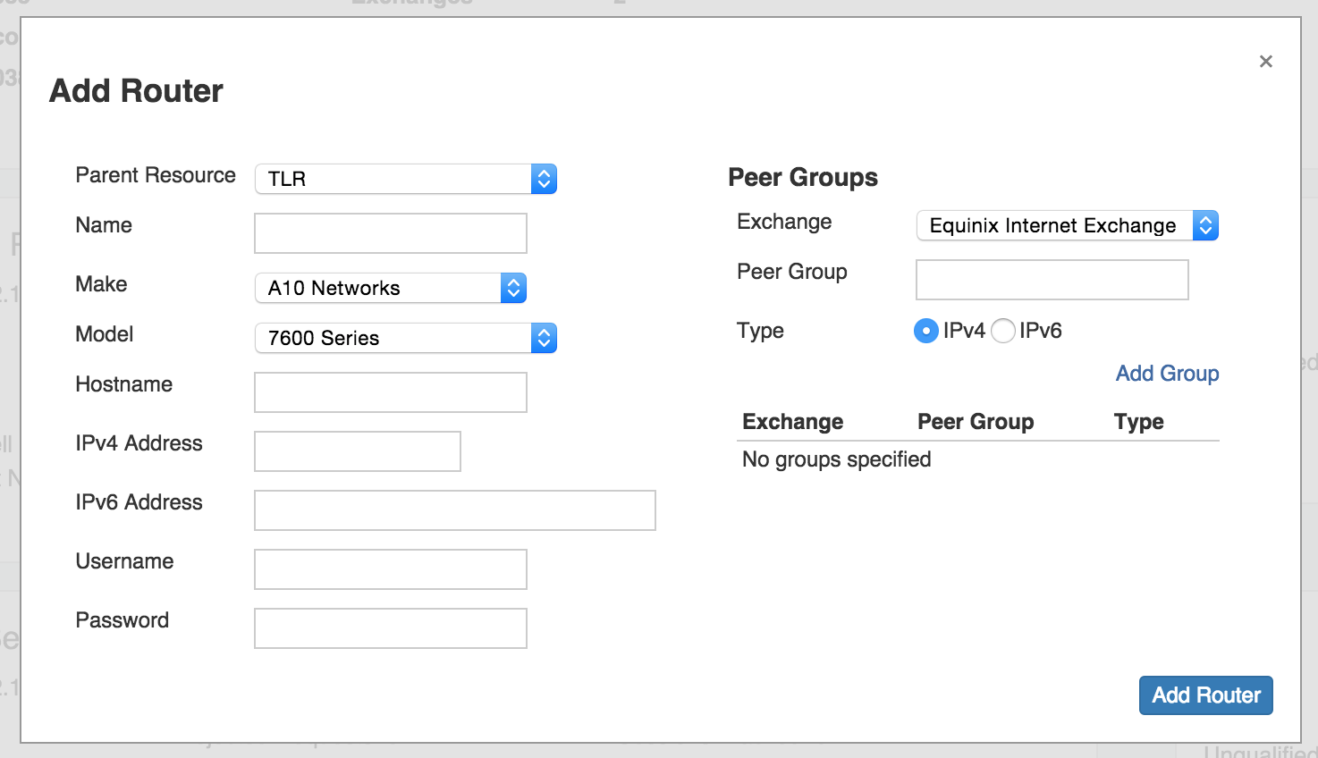 To add a peer group through the "Add Router" dialog: After inputting the Router information, under Peer Groups, select the exchange, type in the name of the desired Peer Group name, select whether it is IPv4 / IPv6, and click "Add Group". Lastly, click "Add Router".