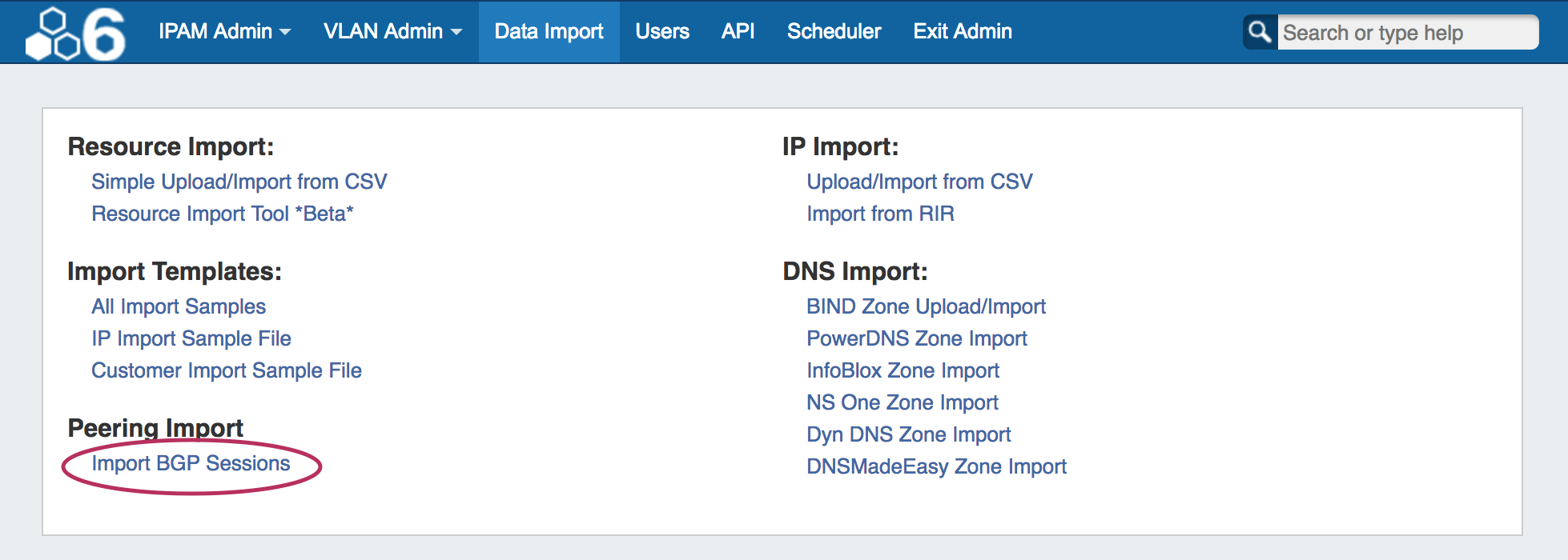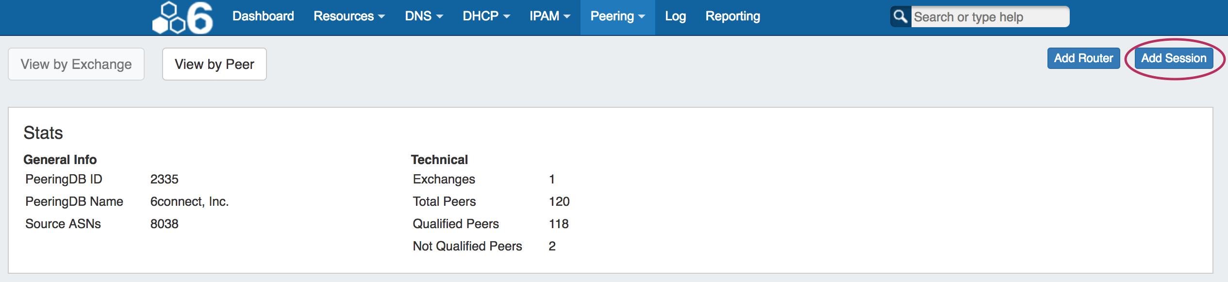 You may add a new session through the "Add Session" button in the Peering tab, or you may (6.1.0-6.1.2) Import Peering Sessions from an existing router. Importing sessions requires Admin level permissions, and is accessed through the Data Import Tab in the Admin section of ProVision.