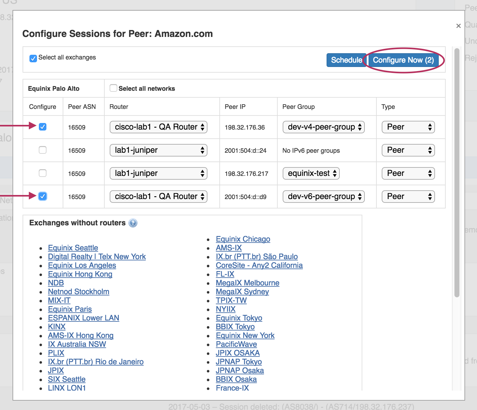 Clicking on "Configure Sessions" opens a modal showing the available exchanges with routers, sessions for that Peer under those exchanges, and options to change the router, peer group, and Peer type.