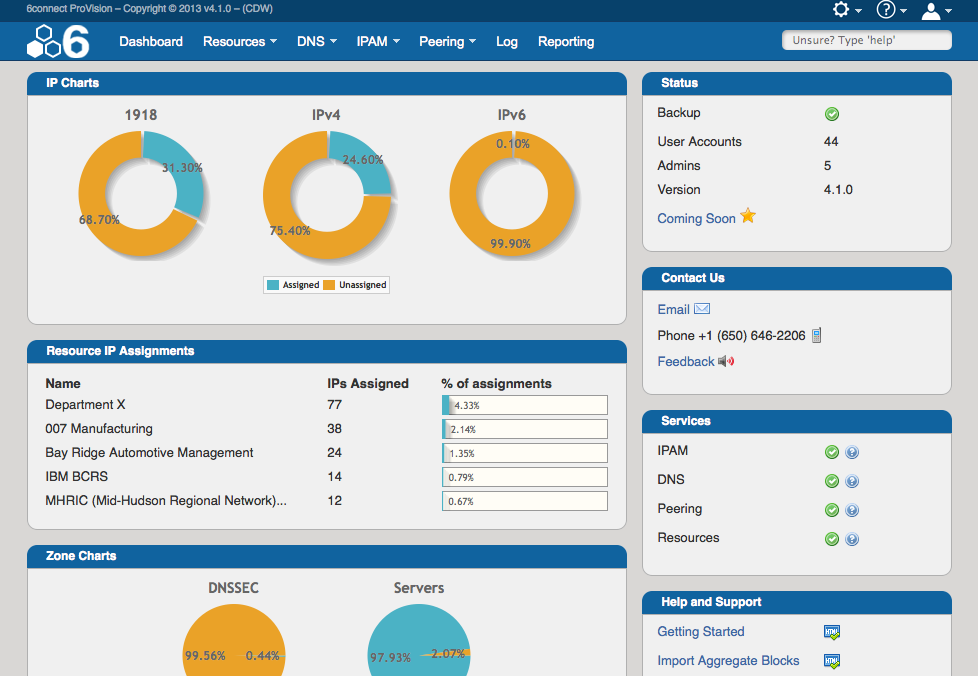 The main dashboard is completely redesigned with pie and bar graphs for a variety of IPAM, DNS, and resource data.