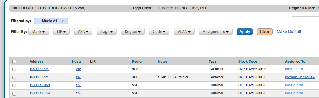 View your IP aggregates in the way you want to view them. Set filters for each aggregate based on Mask, LIR, ASN, Tags, Region, Code, VLAN, or Resource Assignment.