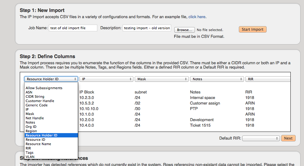 You can now import all data relevant to an IP including Resource Holder ID, Resource ID, Org ID, Net Handle, Customer Handle, Generic Code, ASN, Allow Sub-Assignments, and of course all the basic information.
