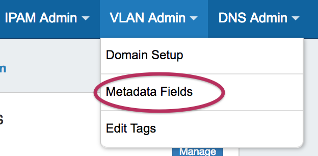 Access VLAN Metadata Fields by selecting "Metadata Fields" from the VLAN Admin navigation dropdown in the Admin section of ProVision: