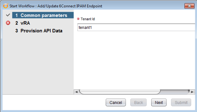 In the Common parameters step, tenantId parameter needs to be entered. This must be the same value as tenant URL value of the corresponding tenant in vRA.