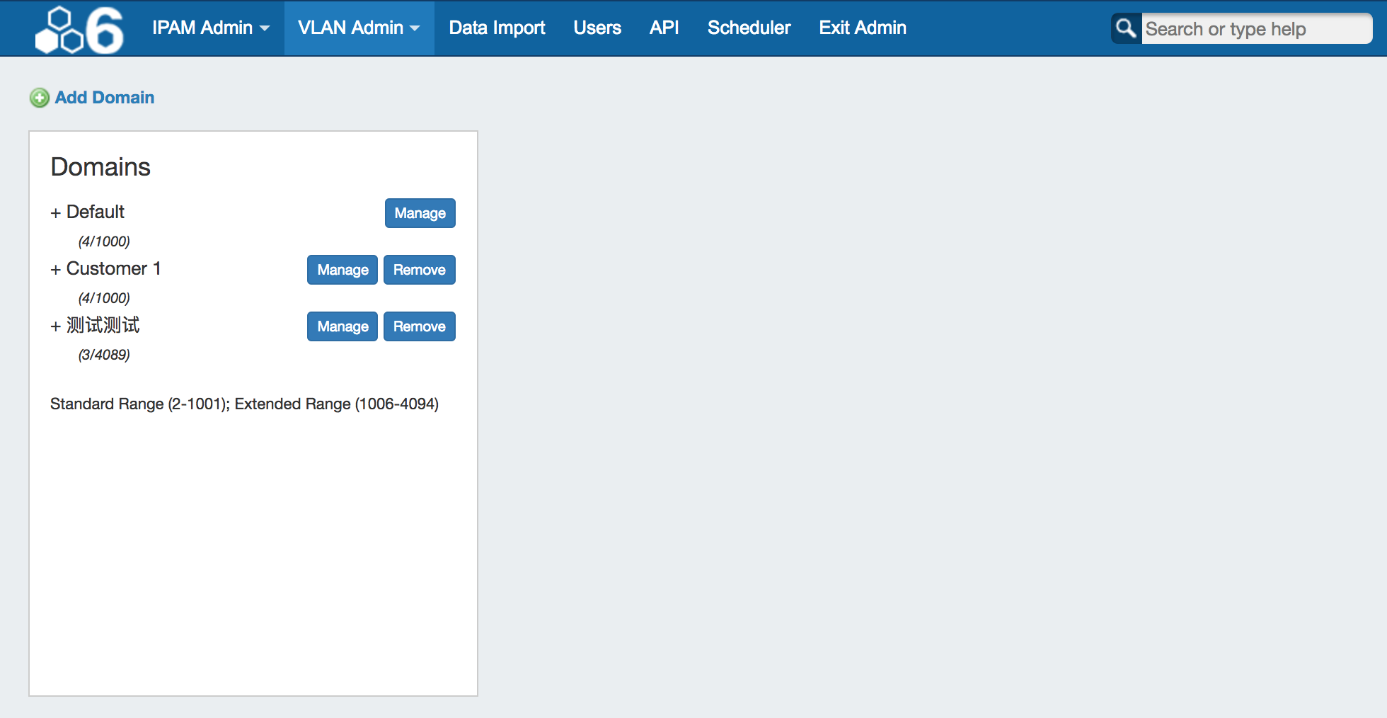 The VLAN Manager allows Admin users to add domains and VLANs to their ProVision instances, and associate them with IP Blocks. Optionally, VLAN tags may be associated with ranges or individual VLANs under a domain, to help limit VLAN search results when enabling VLANs.