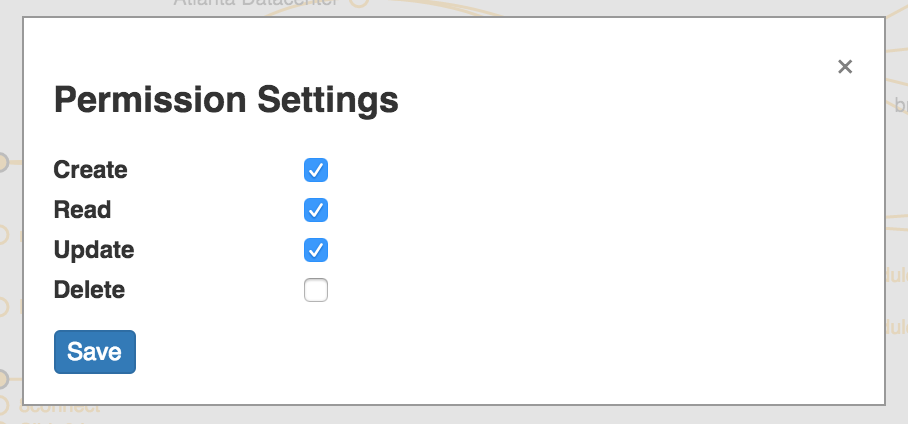 Double clicking on a resource will open up the Edit Permissions box, where CRUD permissions may be updated for allowed Resources. Check / Uncheck the desired permissions level, and click save.