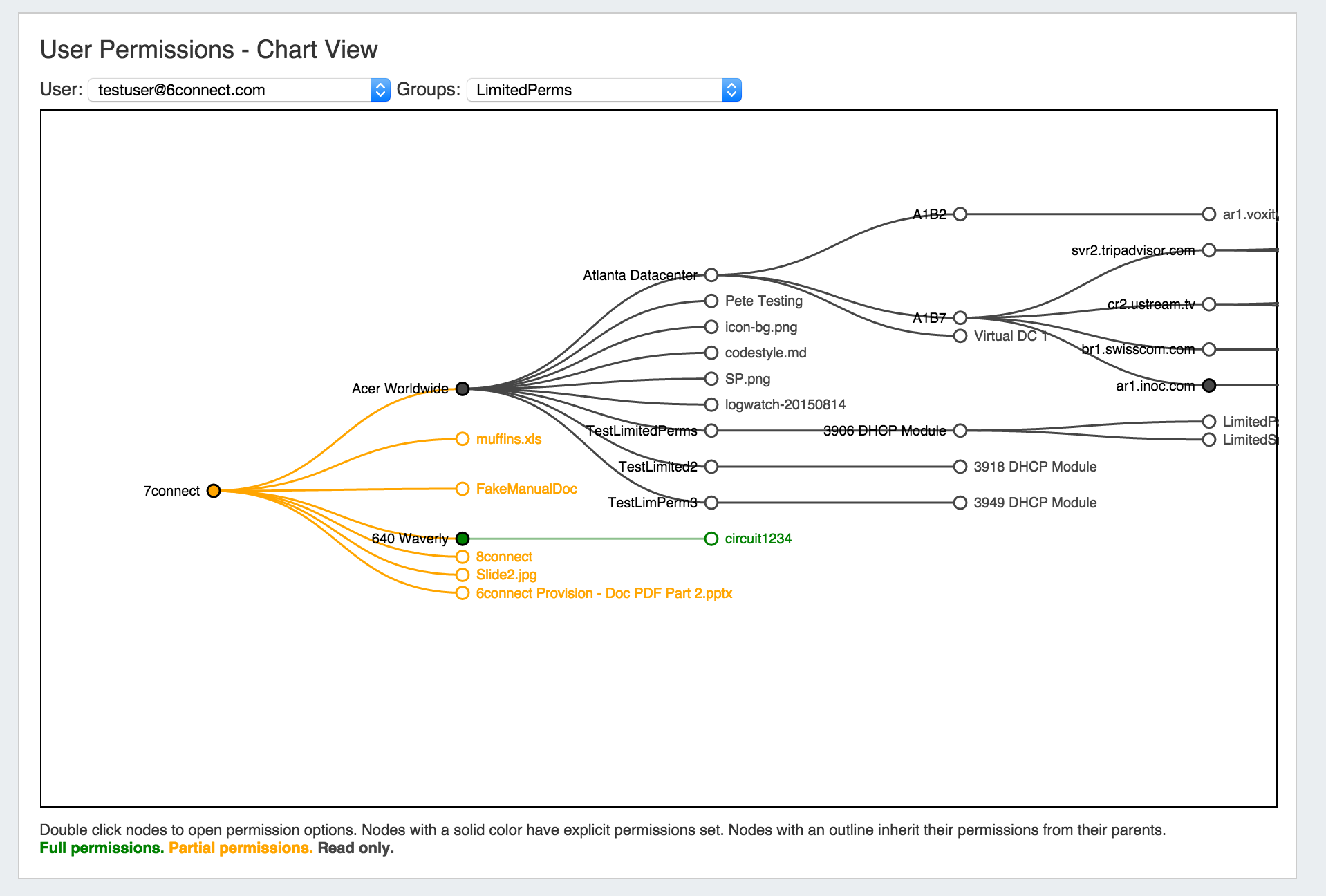 You can graphically view the permissions level of a user by selecting their user name and group from the dropdowns at the top of the chart. The resulting chart will be color coded depending on permissions level.
