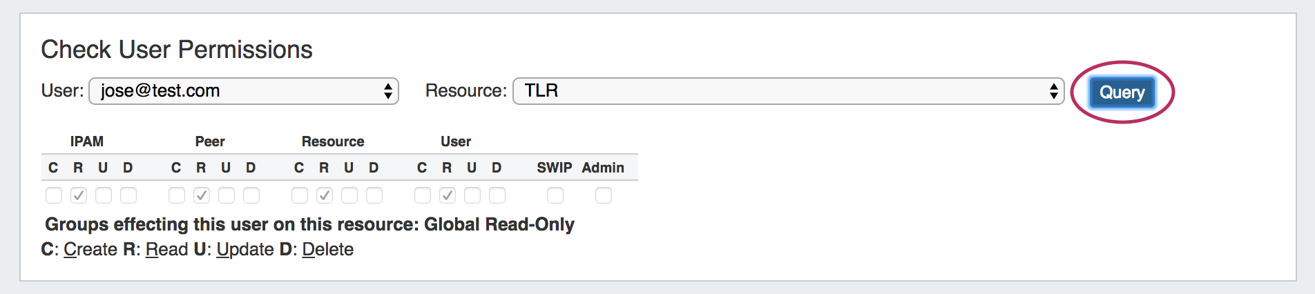 To verify the permissions of a certain user, simply select their user account from the dropdown menu, the resource you are checking against, and click on the green "Query" button.
