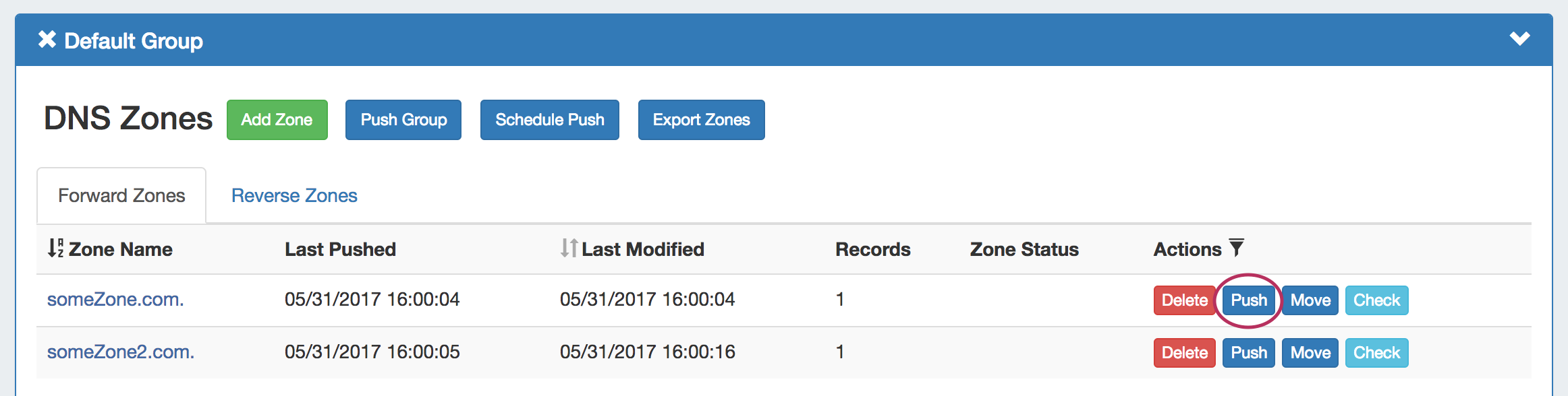 To immediately push a single zone, navigate to the DNS Group the zone is under, then click the "Push" button in the Actions column for the zone. You may also look for the zone in the DNS Zones tab Zone List, and then likewise, click the "Push" button in the zone row.
