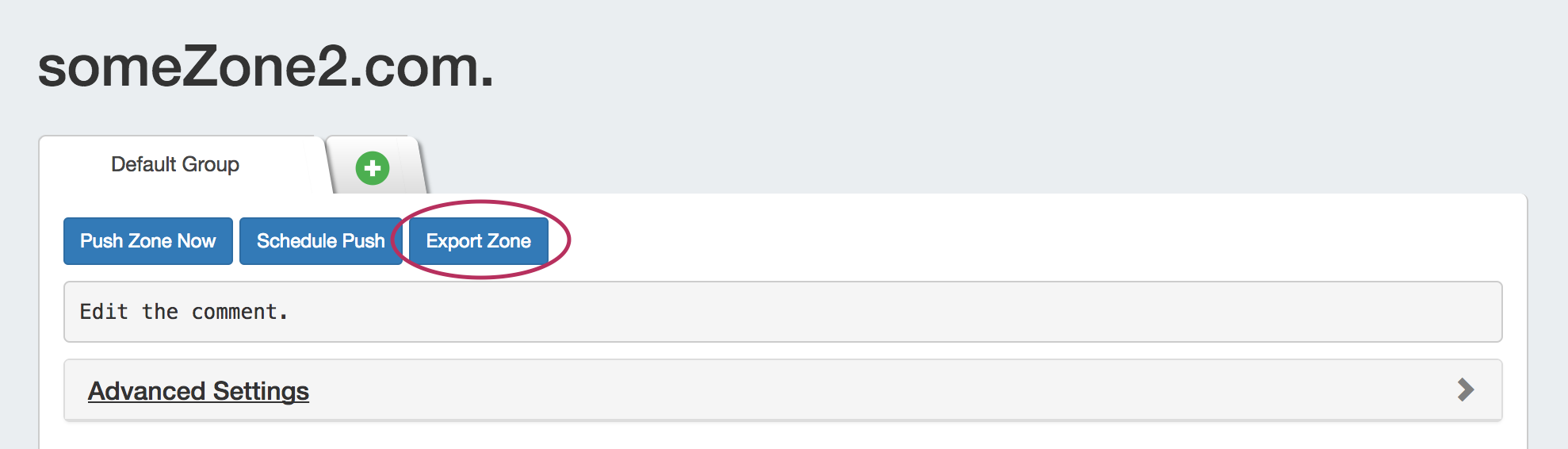 The View Zone page, accessed from clicking on the zone name in the Group zone list, includes a "Push Zone Now" button that immediately attempts to push the zone to the attached server(s).