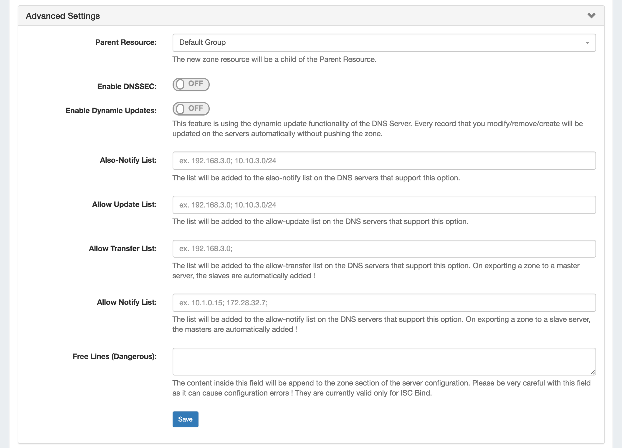 Open the zone "Advanced Settings" section by clicking on the header or the expansion arrow (>). Edit fields as needed, and click "Save" when complete.