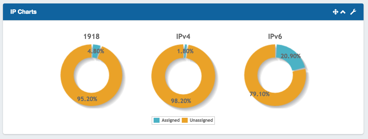 Illustrates the percentage of assigned vs unassigned hosts for 1918 / IPv4 / IPv6 space out of the total available hosts in ProVision viewable by the user.