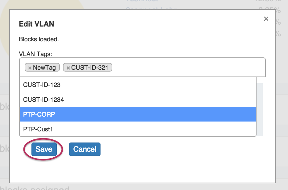 Once assigned, the tags show as a property of the VLAN block in the VLAN edit menu and may be used for VLAN Searches / Assignments.