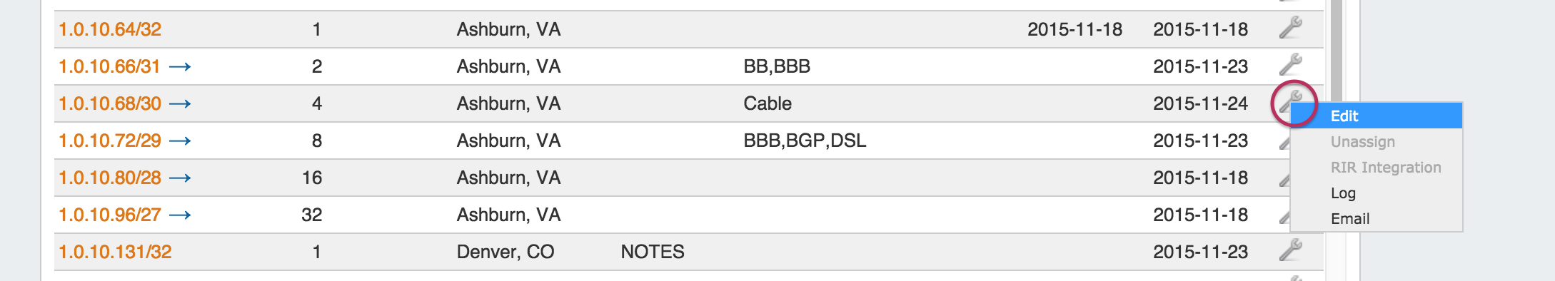 You may also add / edit Domain /VLAN information when editing a block in the IPAM Gadget. From the IP block's Action Menu (wrench icon), select "Edit".