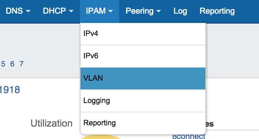 This takes you to the IPAM - VLAN page, which shows an overview of Domains and VLANs on the left sidebar (click the + next to the domain names to see the enabled VLANs under each domain), and similar to the IPAM page, shows IPAM Utilization data for each Domain / VLAN pair. Clicking on the wrench will open "VLAN Manage", which has the same type of functionality for IP blocks as IPAM Manage, but organized under the scope of that VLAN.