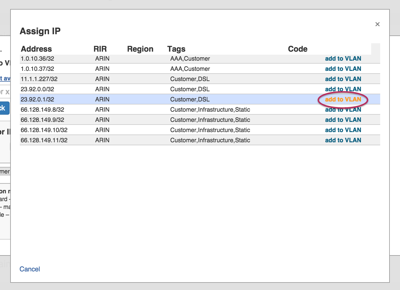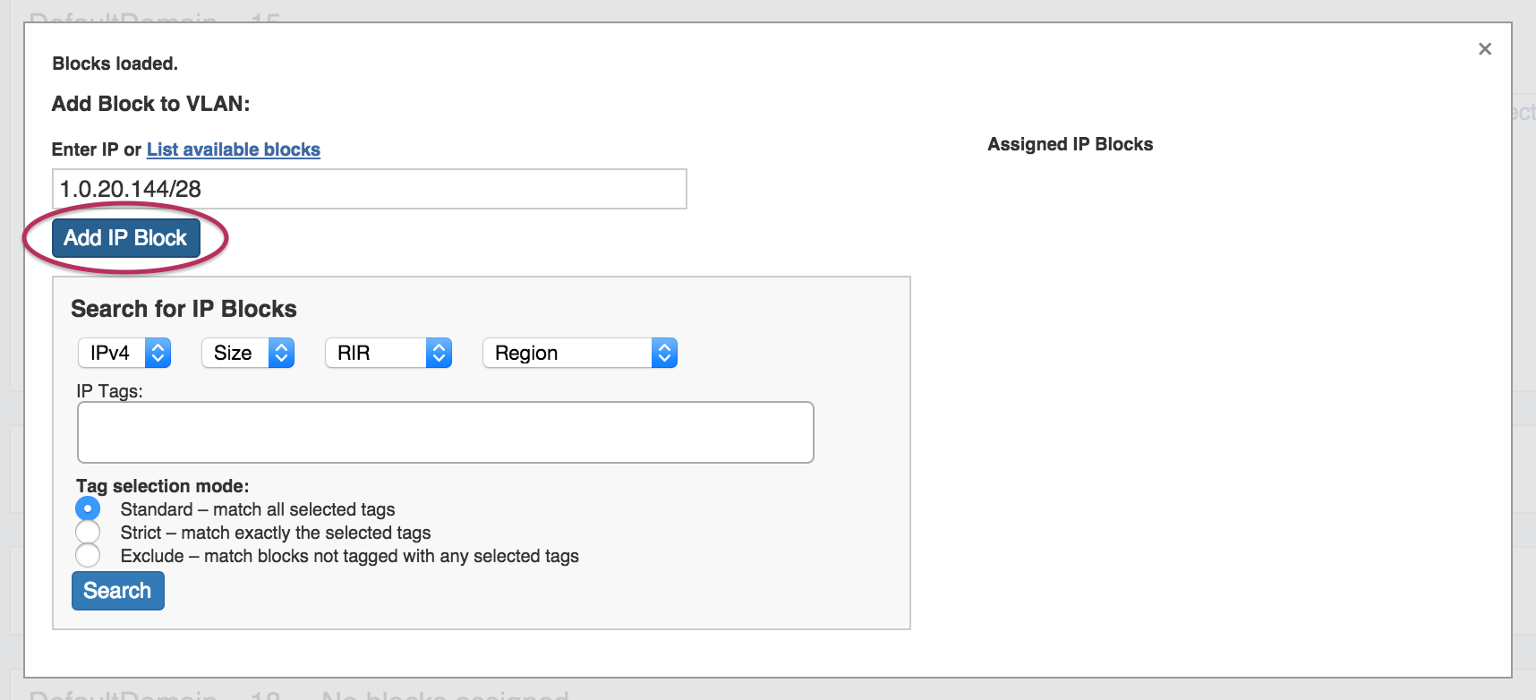 Browse blocks available to add to the VLAN by clicking on the "List available blocks" link above the IP block input box.