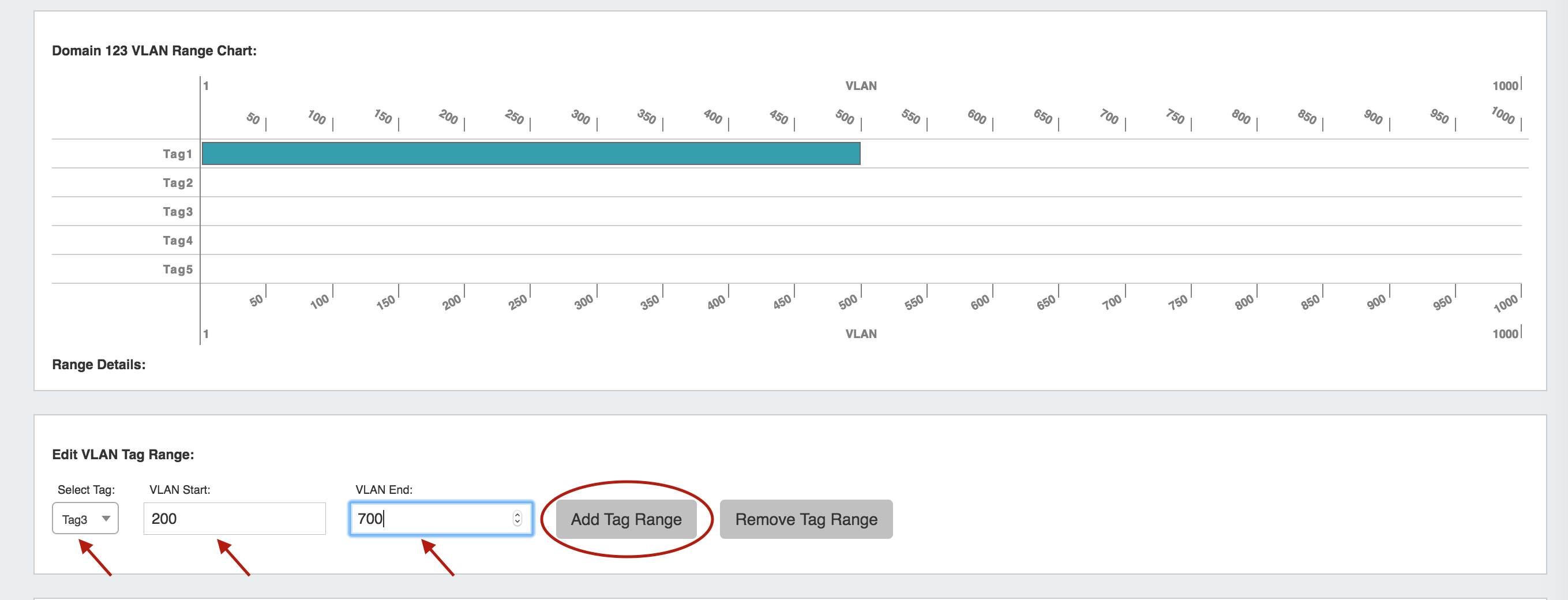 Hovering the mouse over a tag range will show details such as the range start, end, and count of vlans in the range.
