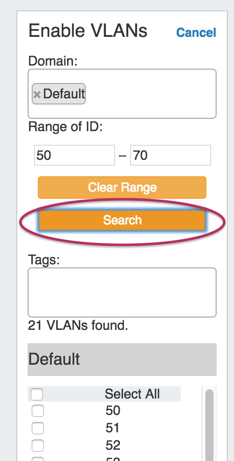 Once VLAN tags have been created, they will be available to add to VLAN ranges and use in the "Add VLAN" search function.