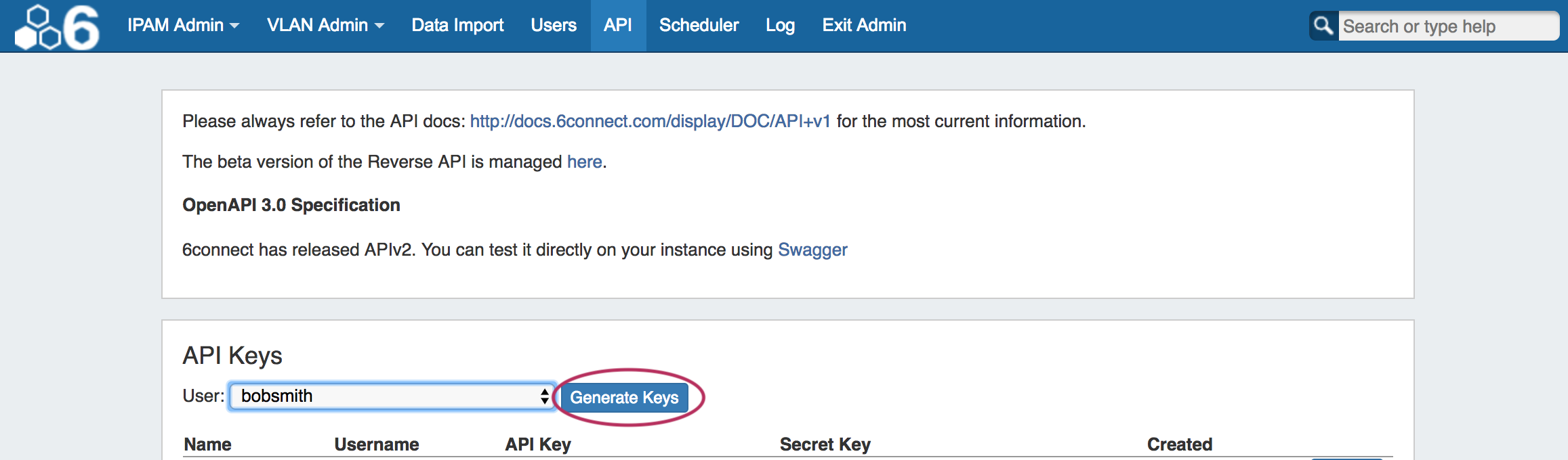 The API tab allows you to create and manager API keys for users. It also provides links to APIv1 / APIv2 documentation and beta Reverse API management.