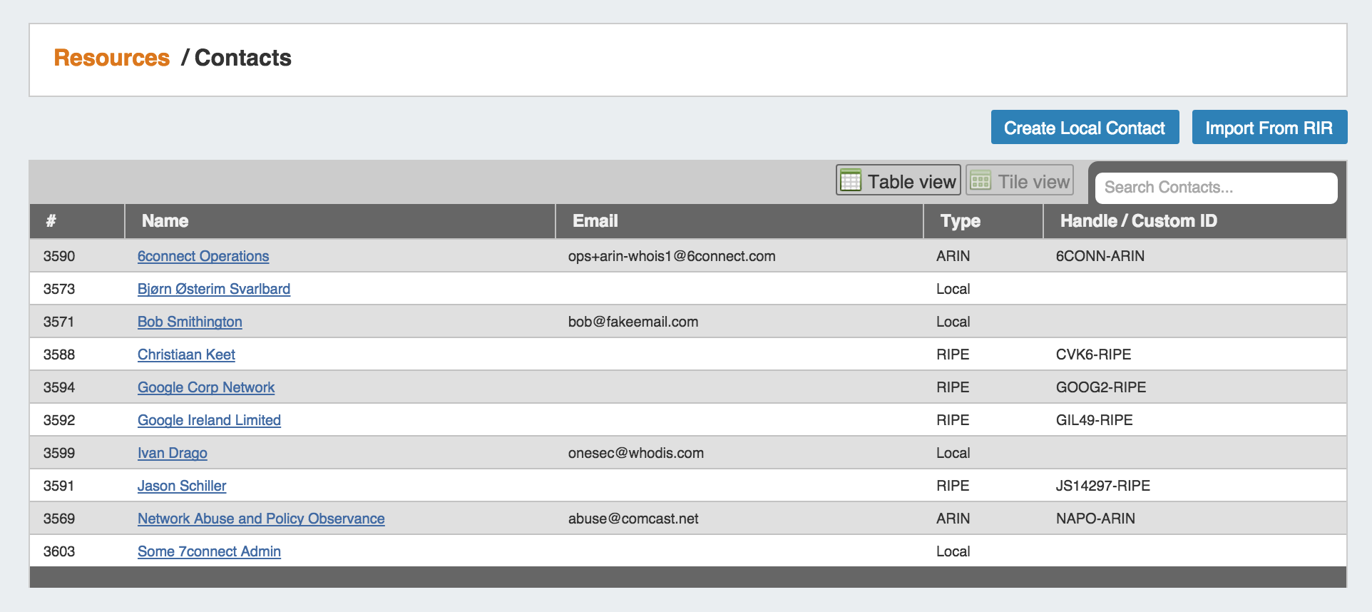 Table View shows contacts in list form, their ID number, email, contact type, and their handle /custom ID. If the contact was manually created through the "Create New Contact" button, it will show as type "Local", whereas a contact imported from RIR will show of type "RIPE" or "ARIN".