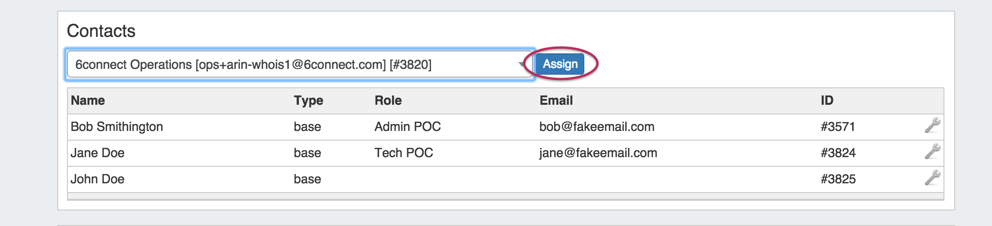 Once a contact has been assigned, you can create and set a role for the contact by clicking on the Action Menu (wrench icon).