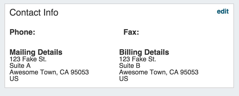 This Gadget is used on the Resource Holder Section type. In the Contact Info Gadget, you can track information such as mailing / billing addresses, phone number, and fax number for that Resource.