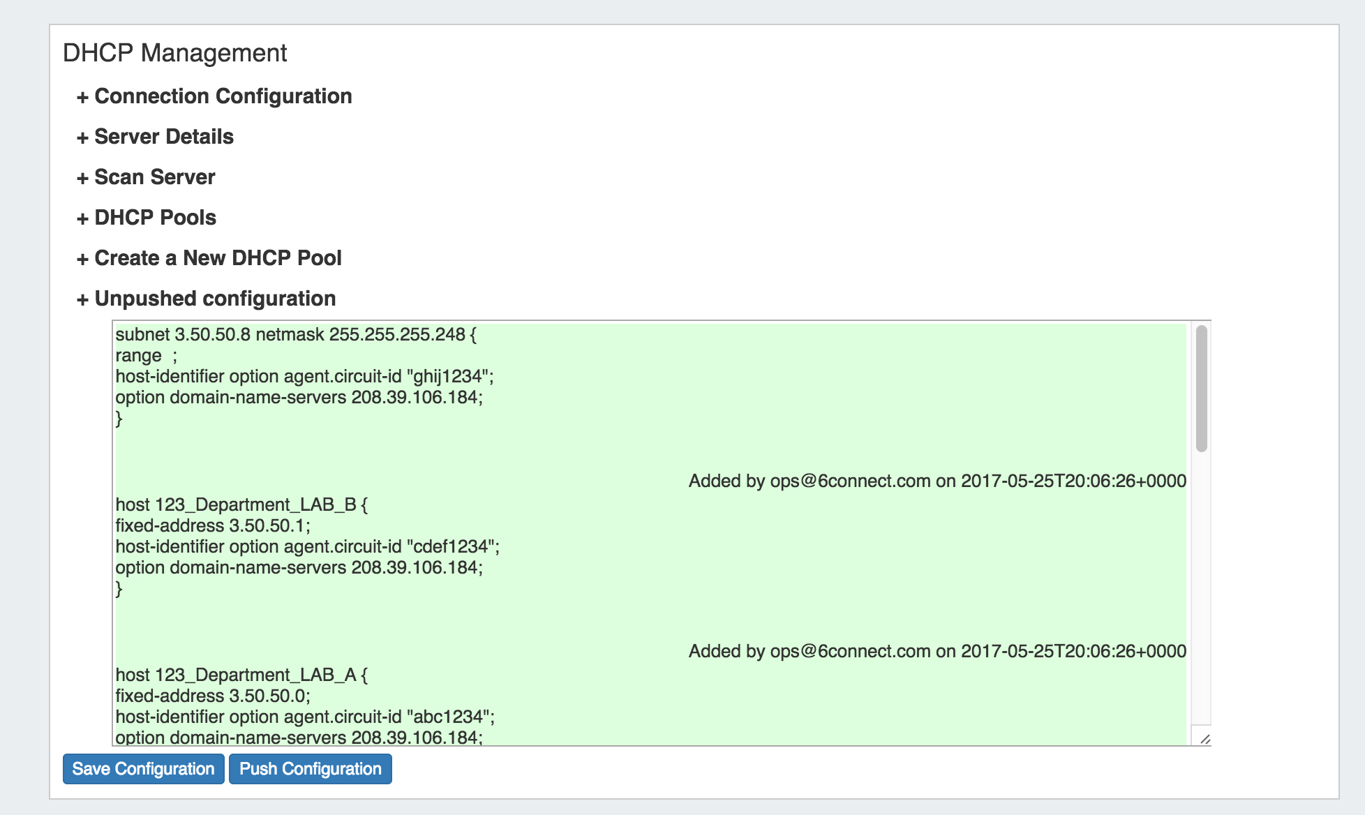 When a configuration has been saved from the DHCP Customer Configuration Gadget, it will appear as an "Unpushed Configuration" in the DHCP Management Gadget for the DHCP Server. If you expand that option, you will see the config elements highlighted – red are config elements that will be deleted, green are config elements that will be added.