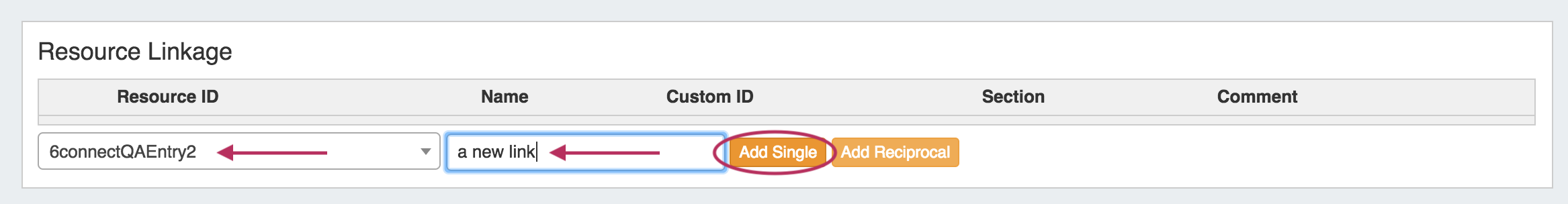 Search for the desired Resource to add, select, type in notes if desired, and then click the "Add Single" or "Add Reciprocal" button. The linked Resource will show in the Resource list.