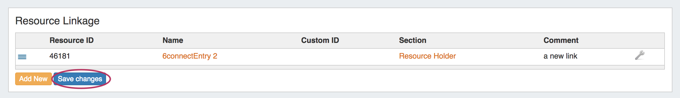 Once a resource link has been saved, you may click on the link to go to the linked Resource's Entry page, or use the Action Menu (wrench icon) to Edit or Delete the link.