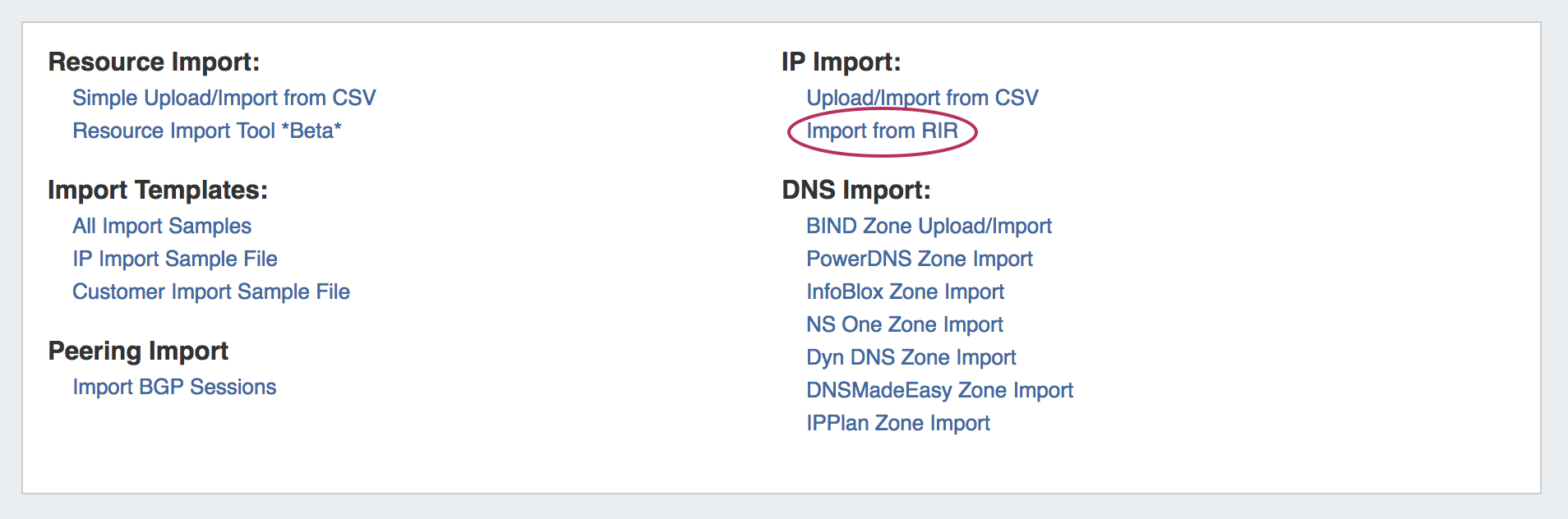 From the Data Import Tab, select "Import from RIR" under "IP Import".