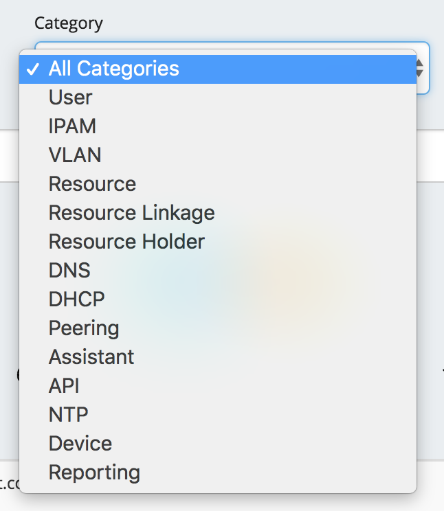 Category: Under the "Category" dropdown box, select "All Categories", "User", "IPAM", "VLAN", "Resource", "Resource Linkage", "Resource Holder", "DNS", "Peering", "Assistant", "API", "NTP", "Device", or "Reporting".
