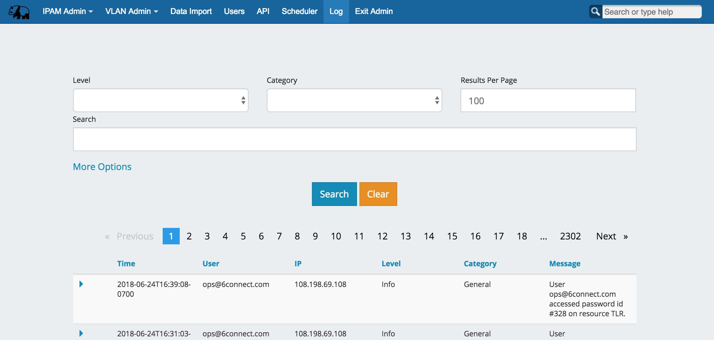Results per page: In the "Results per page" text box, type the desired number of log entries to see per page. By default, this value is set to 100.