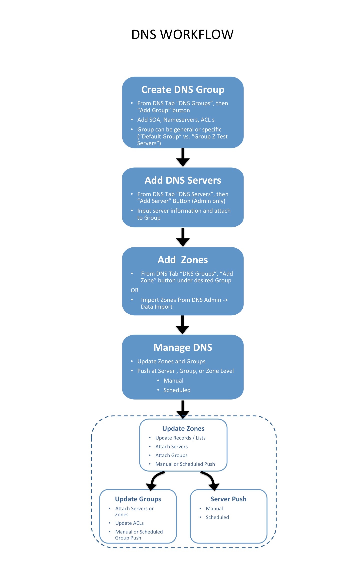 DNSv3 revolves around Groups. Zones are gathered under Groups, servers attached to Groups, and pushes may be done on a per Group level. Thus, the first workflow step in DNSv3 is to set up one or more DNS Groups. A "Default Group" is automatically provided in ProVision, but other Groups may be desired to organize zones and default values.
