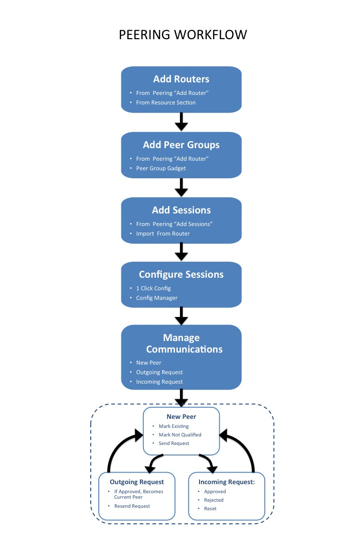 After the router(s) and Peer Groups have been created in ProVision, Sessions need to be added. Sessions may be added manually through the "Add Session" dialog in the (7.0.0-7.0.2) Peering tab, or Imported from a router (requires ProVision Admin permissions).
