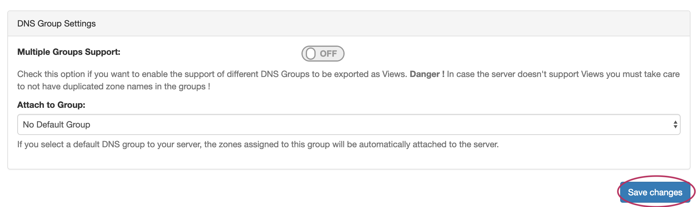 In the last section, select whether to enable support for exporting DNS Groups as Views (click to toggle ON / OFF), and select a default Group, if desired, to be associated with the server. Zones assigned to the selected Group will automatically be attached to the server.